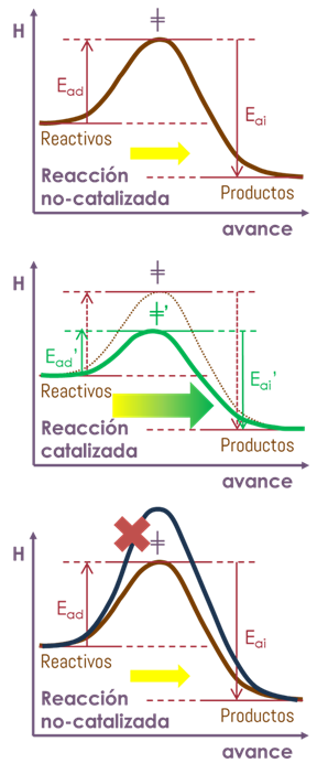 Muchos libros de texto incluyen un concepto erróneo que hay que evitar: el «catalizador negativo». Los autores de estos libros mantienen que existen dos tipos de catalizadores: los “catalizadores positivos”, que disminuyen la Ea y aumentan la velocidad de reacción, y los “catalizadores negativos” o “inhibidores” que aumentan la Ea y disminuyen la velocidad. Esto es FALSO.